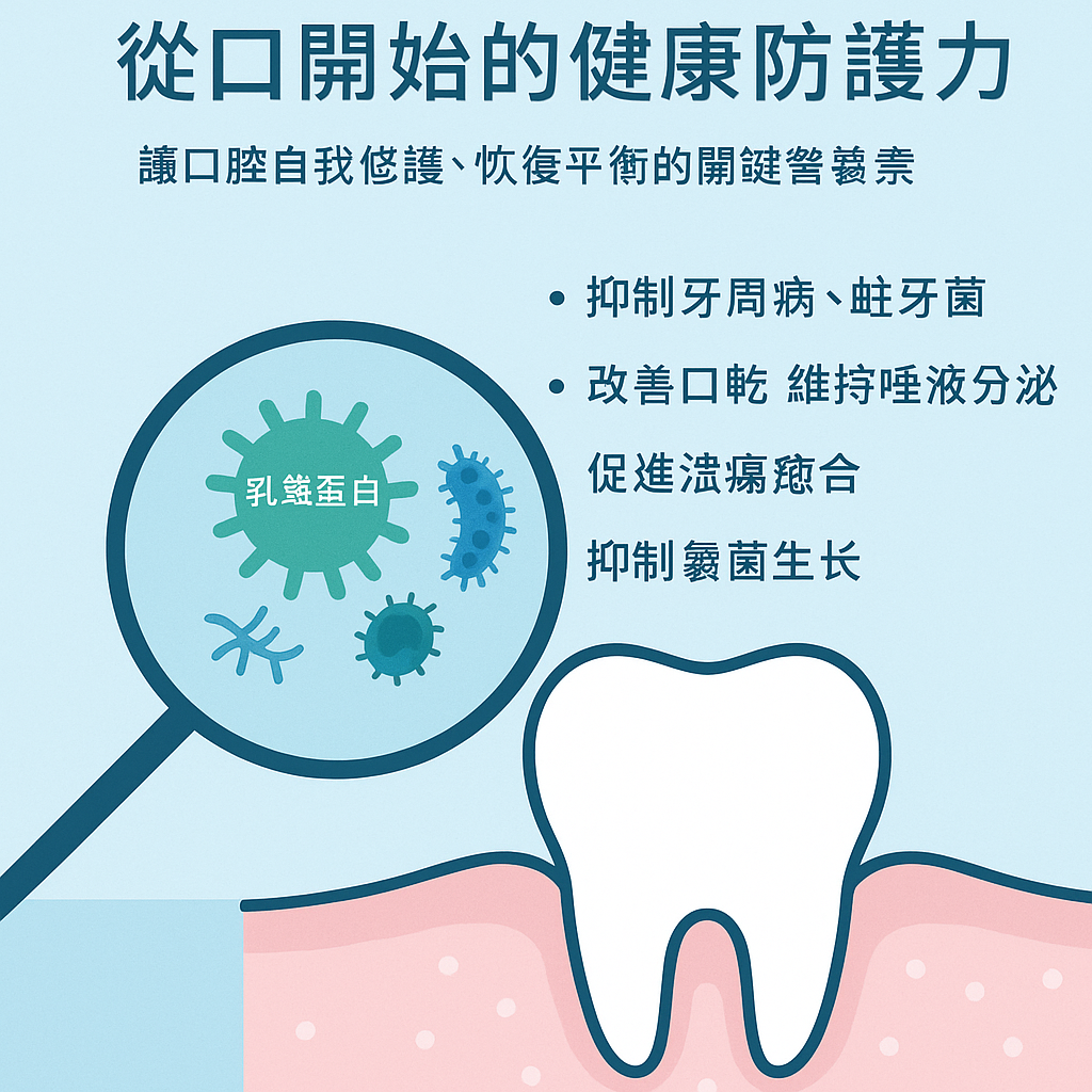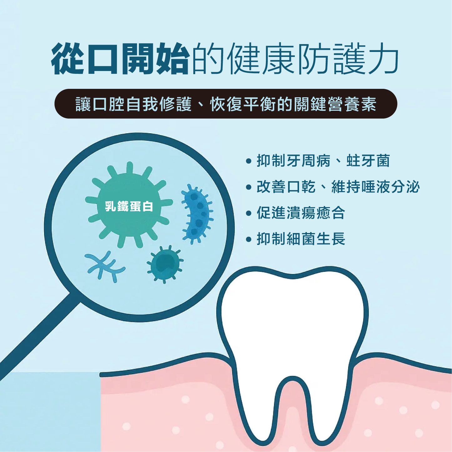 研究指出,乳鐵蛋白能有效抑制牙周病菌與蛀牙菌的生長,