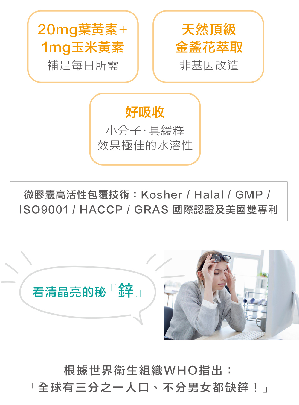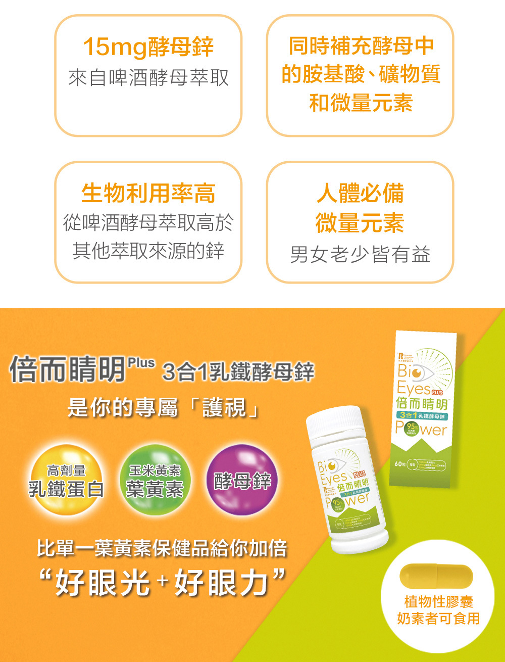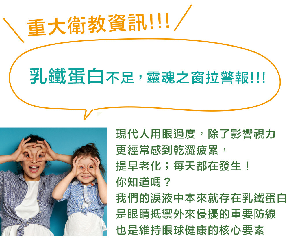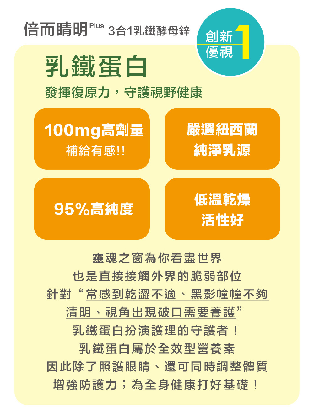高劑量高純度乳鐵蛋白結合葉黃素與酵母鋅的創新複合護視保健品