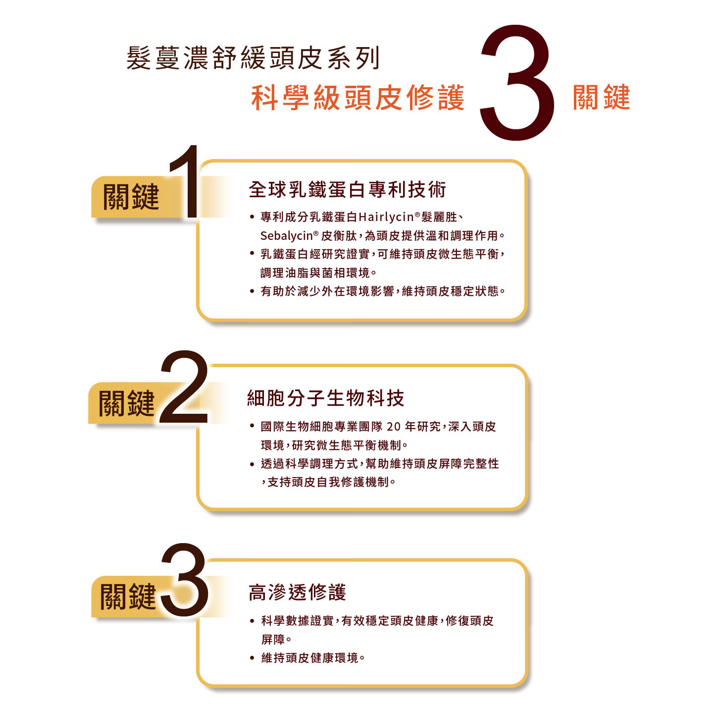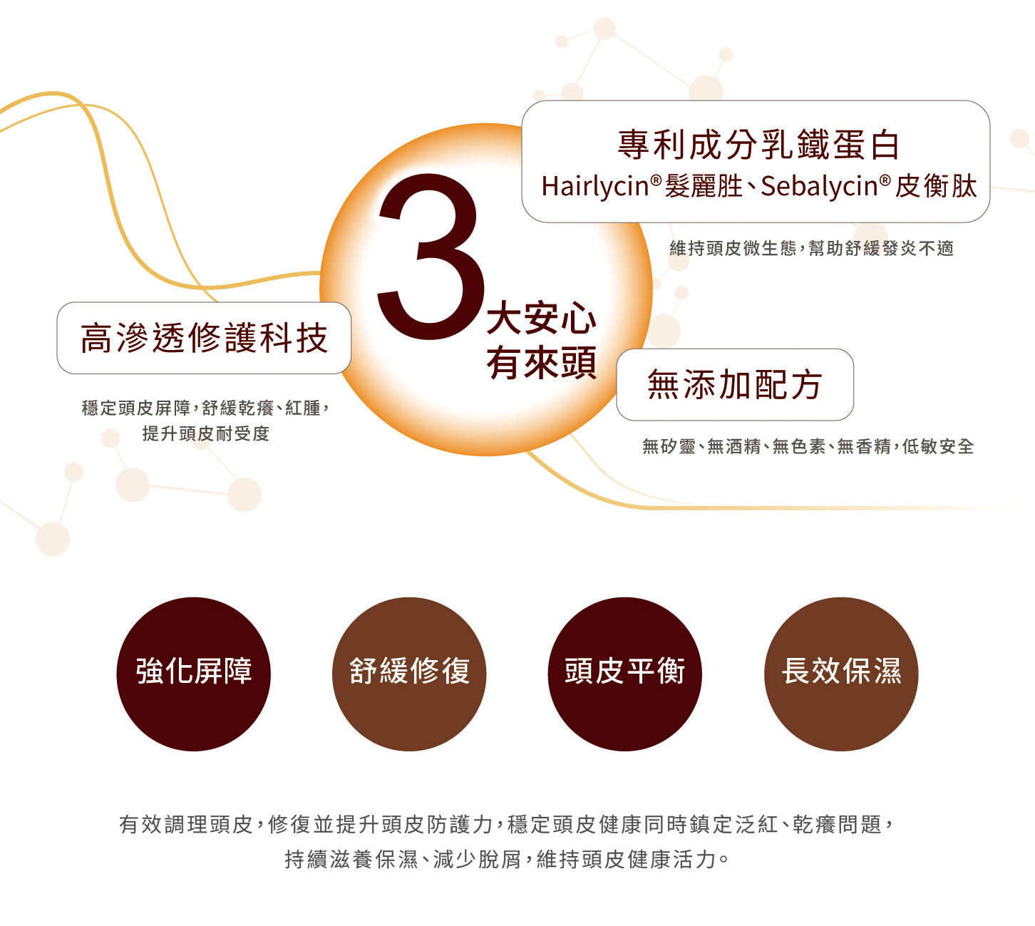 專利成份 乳鐵蛋白 Hairlycin髮麗胜、 Sebalycin® 皮衡肽,維持頭皮微生態,幫助舒緩發炎不適